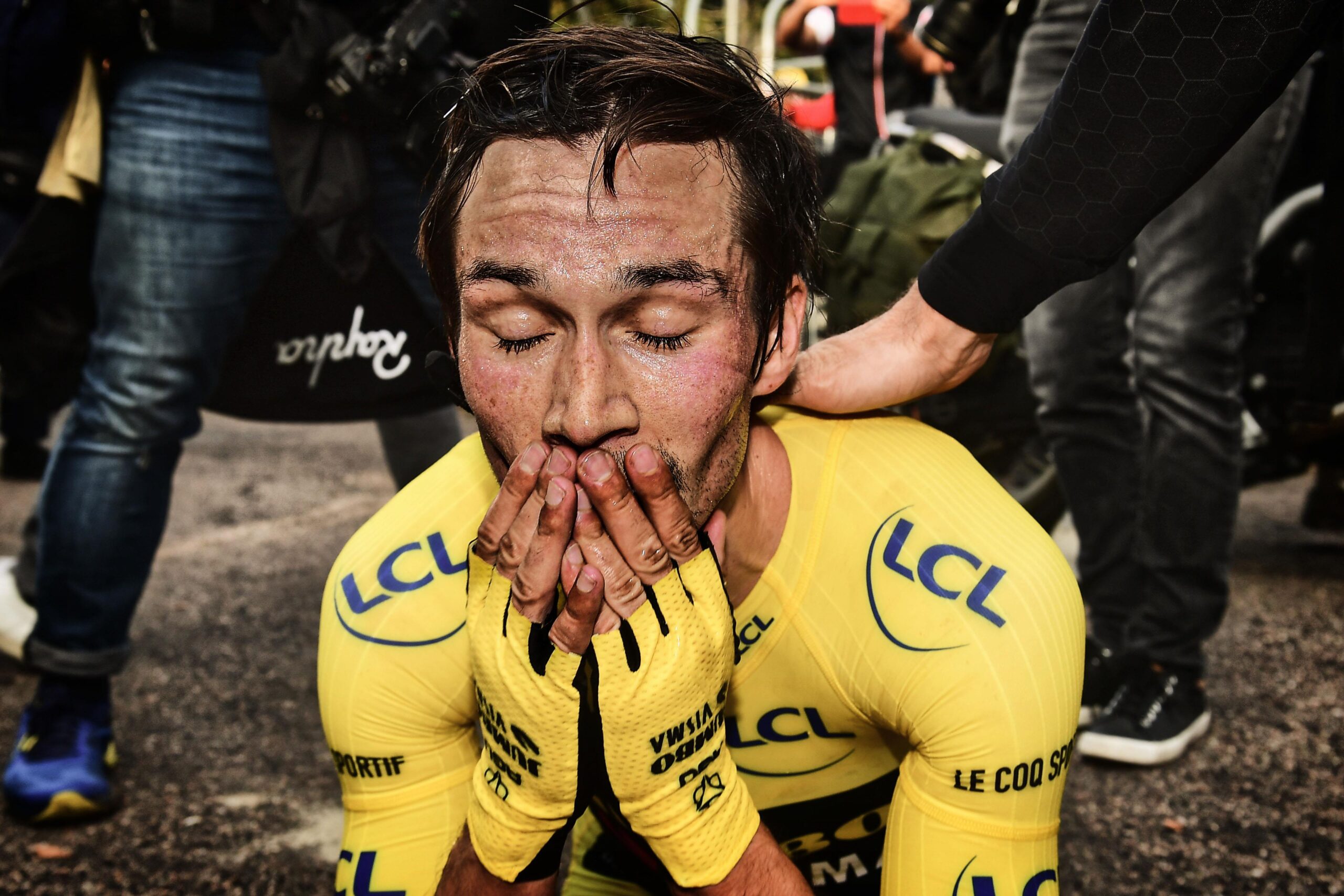 Merijn Zeeman (sportief directeur van Jumbo-Visma) is drie dagen geleden uit de Tour gezet, omdat hij een jurylid verweet dat die het crankstel van Roglic’ tijdritfiets tijdens een materiaalinspectie had gemold. Zeeman is nu gedoemd op een campingstoeltje aan de wegkant tussentijden te noteren. Hij is een anonieme getuige, die dra de grootste desillusie van zijn wielerleven zal beleven. Drie Jumbo’s bij de eerste vijf in de tijdrit!? Ja. Maar dat telt niet in een ultieme strijd om de eindzege. ‘Pogla’ deklasseert ‘Rogla’.
