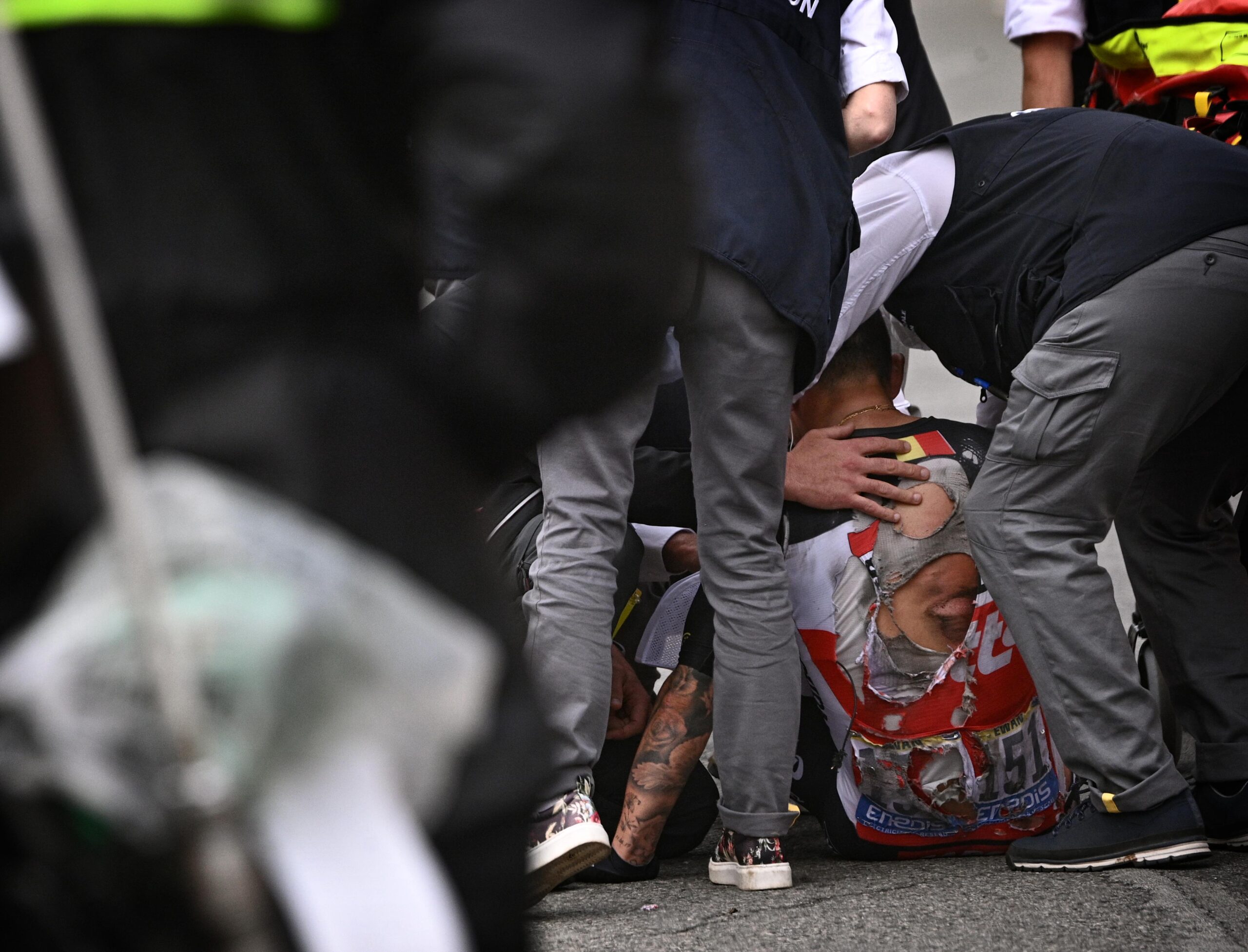 Neem Jumbo-Visma. Robert Gesink, hersenschudding, gebroken sleutelbeen, is uit koers, kopman Primoz Roglic viel opnieuw hard op de grond (trauma aan het staartbeen, zegt het medisch bulletin), net als Steven Kruijswijk en Tony Martin. De teambus werd een mini-hospitaal.