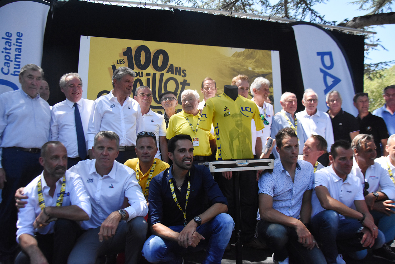 In Pau was voor de start van de tijdrit een bijzondere ceremonie georganiseerd ter viering van le Centennaire du Jaune, Honderd Jaar Geel. Het gebeurde in de Monde des Géants, een park waar de groten van de Tour met hun beeltenissen en palmares bijeen zijn gezet in gele zuilen.