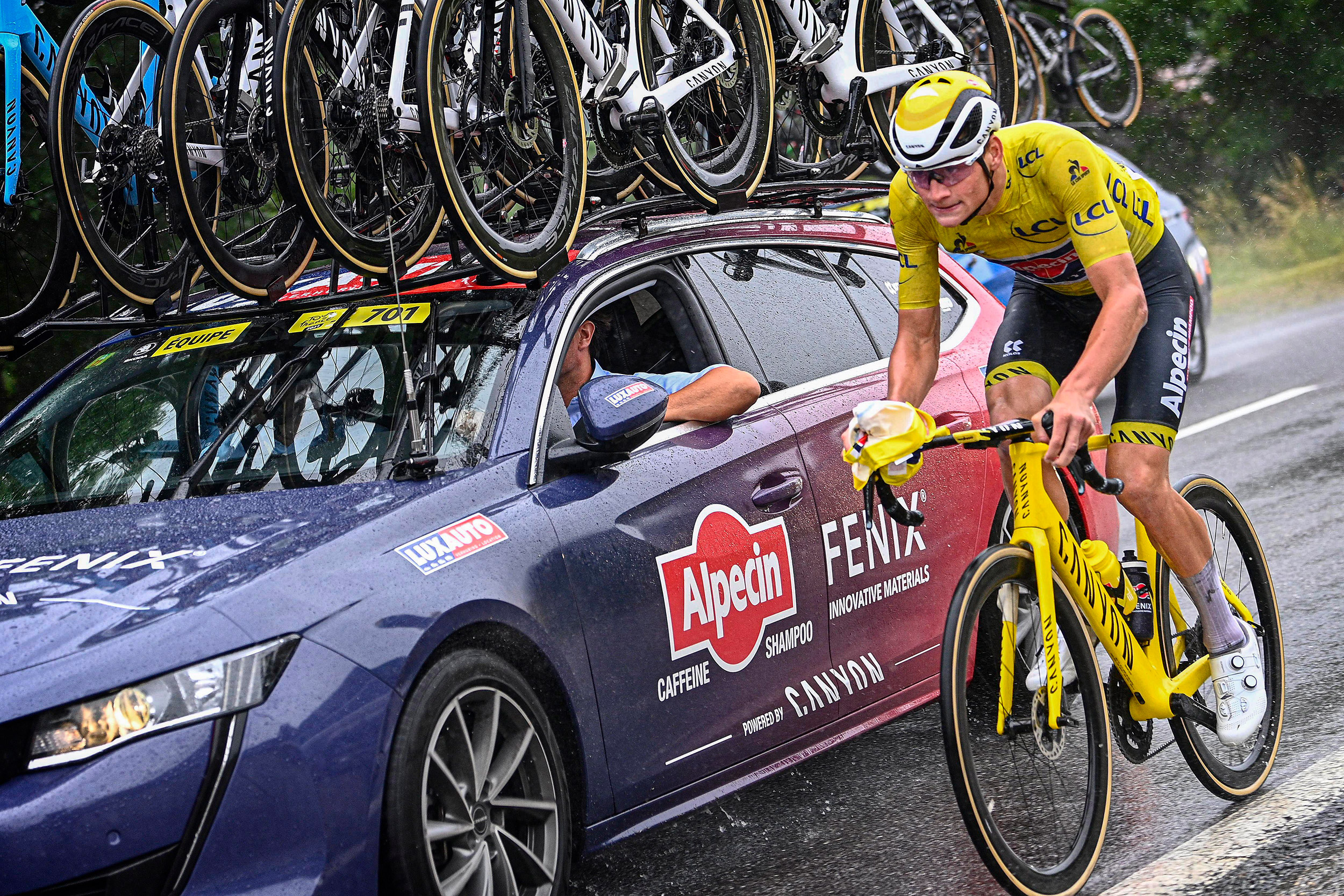 Dat was zeven dagen geen taal geweest waarvan Mathieu van der Poel zich normaliter bediende. Kop goed, lijf goed, gemoed goed. Maar ook aan zíjn fysieke mogelijkheden bleken dus grenzen te kleven. Eigenlijk had hij gedacht de Tour al eerder vaarwel te gaan zeggen; ritzege (en wát voor één), gele trui zeven dagen om de schouders, ploegmaat Merlier aan een sprintzege geholpen – wat bleef er nog meer te wensen voor een Tourdebutant?