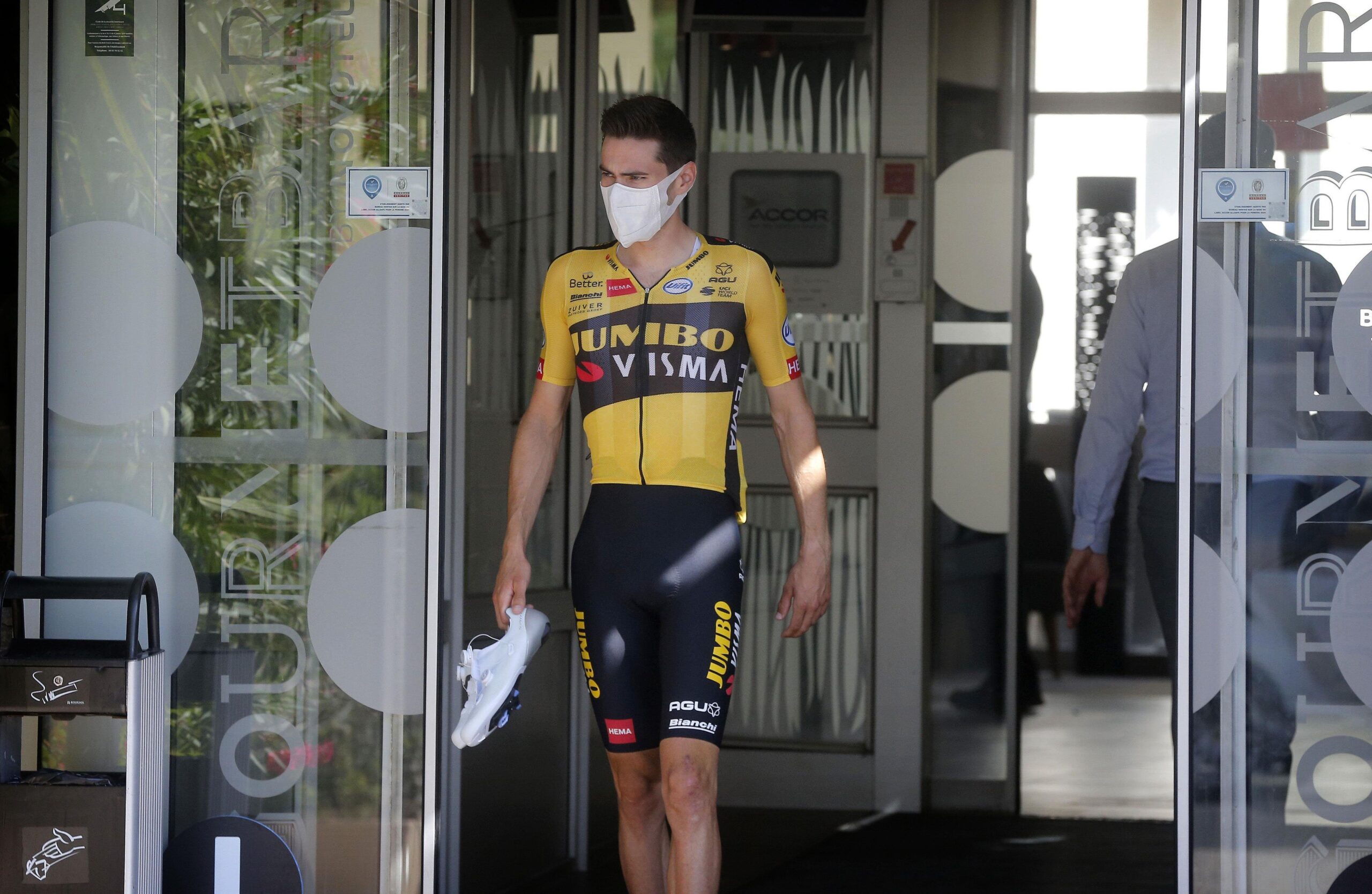 Tom Dumoulin heeft de supporters die langs de kant zullen staan alvast het dringende verzoek gedaan wel zo’n masker voor te doen, in de hoop dat ze dan met hun enthousiaste aanmoedigingen niet ook wat Covid 19-druppels uitspuwen.
