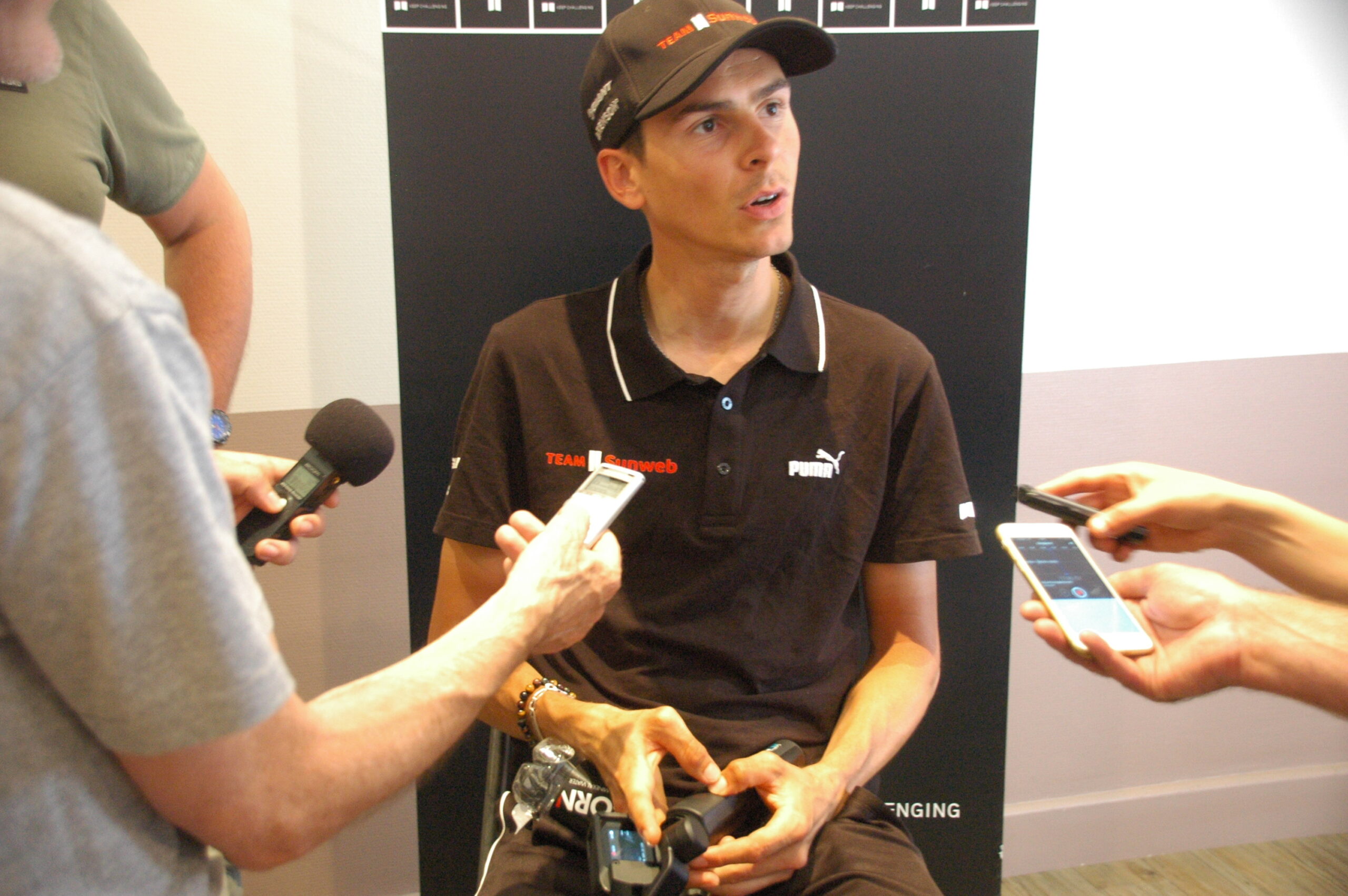 Warren Barguil werd het meest van allen omringd door journalisten in het slordig ingerichte zijzaaltje naast de lobby van Hôtel de Bordeaux aan de Place Gambetta in Bergerac. Pers-uur van Sunweb, op de eerste rustdag. De jonge Fransman is de groeidiamant in de door Nederlanders geleide ploeg. Hij komt uit Bretagne, heeft de jongen nog op zijn wangen. Zonder bijzondere resultaten waren zijn Nederlandse collega’s minder in trek. Korte een-tweetjes, meer niet. In het ontbijtgedeelte presenteerde Gio Lippens het journalistenforum van Radio Tour de France. Er was genoeg te bespreken over de gevaren van de ronde.