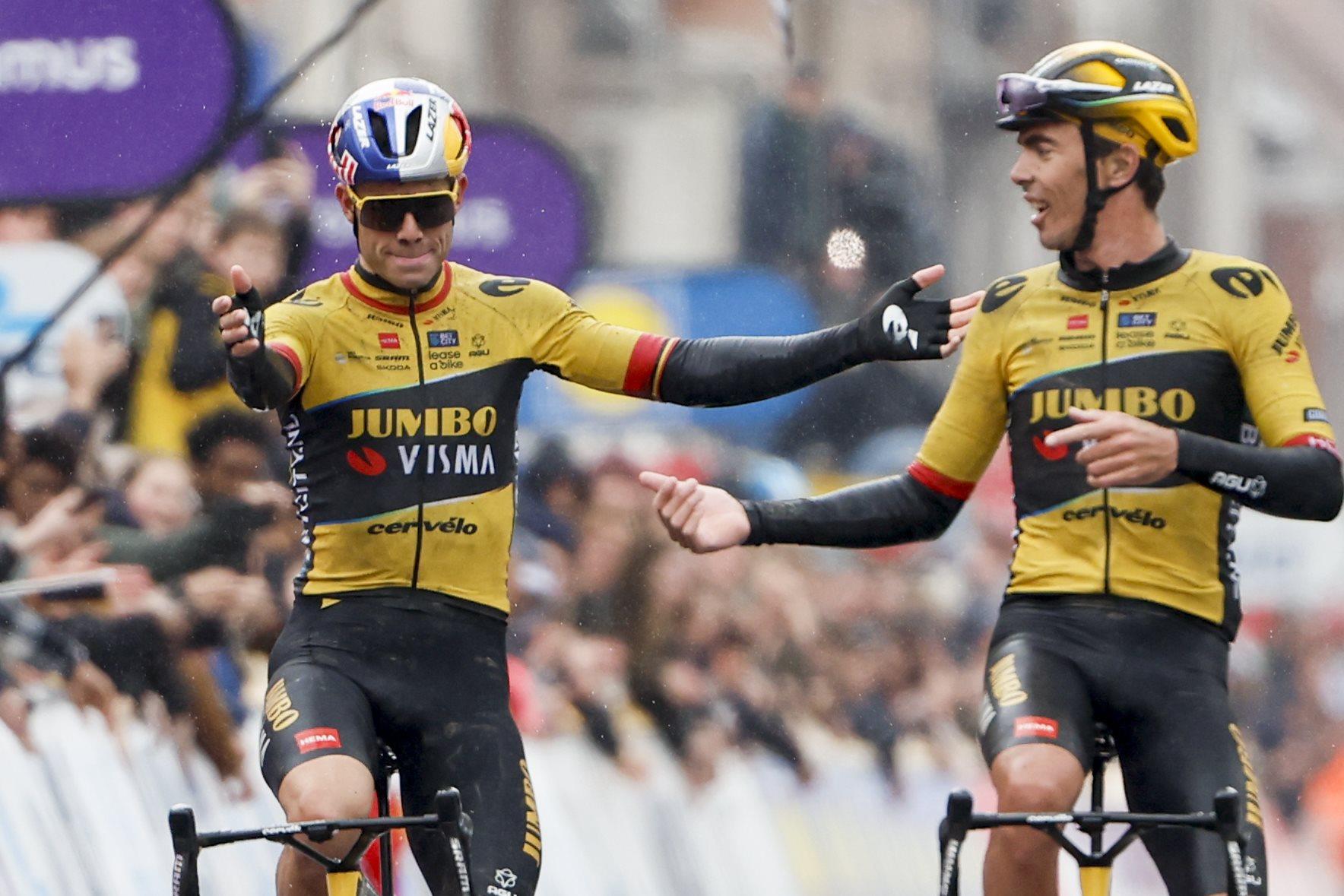 Rechts zit de Fransman Christophe Laporte met de armen net iets weidser. Hij draagt geen handschoenen en iets in zijn houding geeft aan: ‘Ik kan hier niets aan doen, maar we hebben dit samen zo besloten…’
