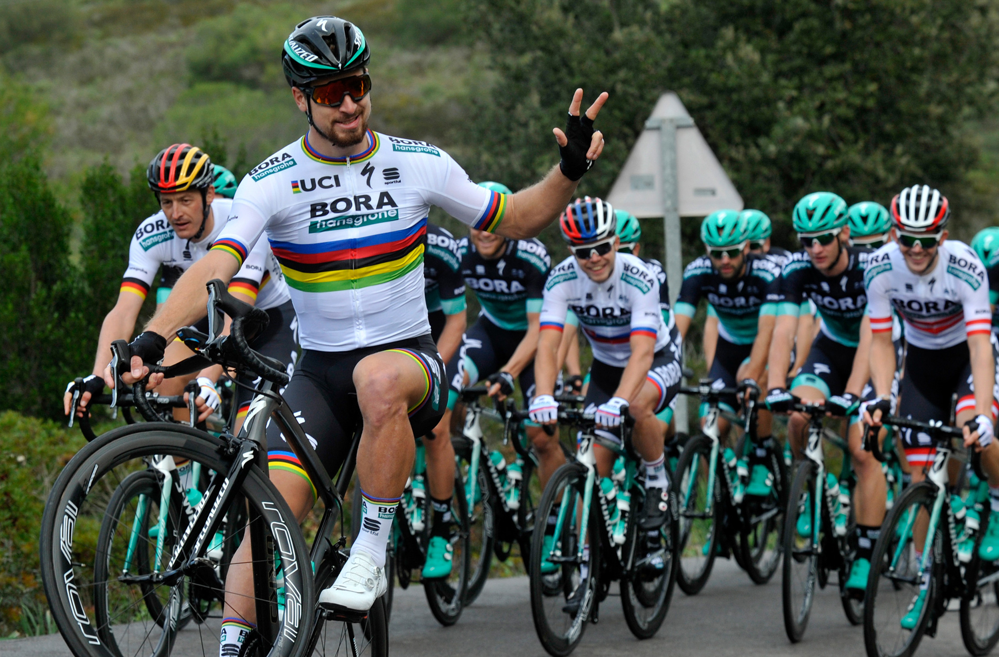 Maar de dertiger die opeens in mijn gezichtsveld sprong, droeg een shirt van een wél bijzondere figuratie. Wit shirt, regenboogbanen, op de borst de letters BORA. Het rennersshirt van Peter Sagan, drievoudig wereldkampioen wielrennen, die op dat moment zijn laatste voorbereidingen deed om te laten zien wat hij zaterdag op de persconferentie precies bedoelde met ‘aanvallen loont’.