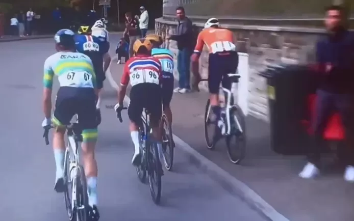 Het duurde een paar seconden en vergde een luttel aantal meters, maar leidde tot een protest na het WK op de weg en tot een boze open brief van de Letse wielerbond aan de UCI. Het ging om Mathieu van der Poel die 58 kilometer voor de finish de stoep op fietste nadat Marc Hirschi leek te demarreren uit de groep die in achtervolging was op Tadej Pogačar.
