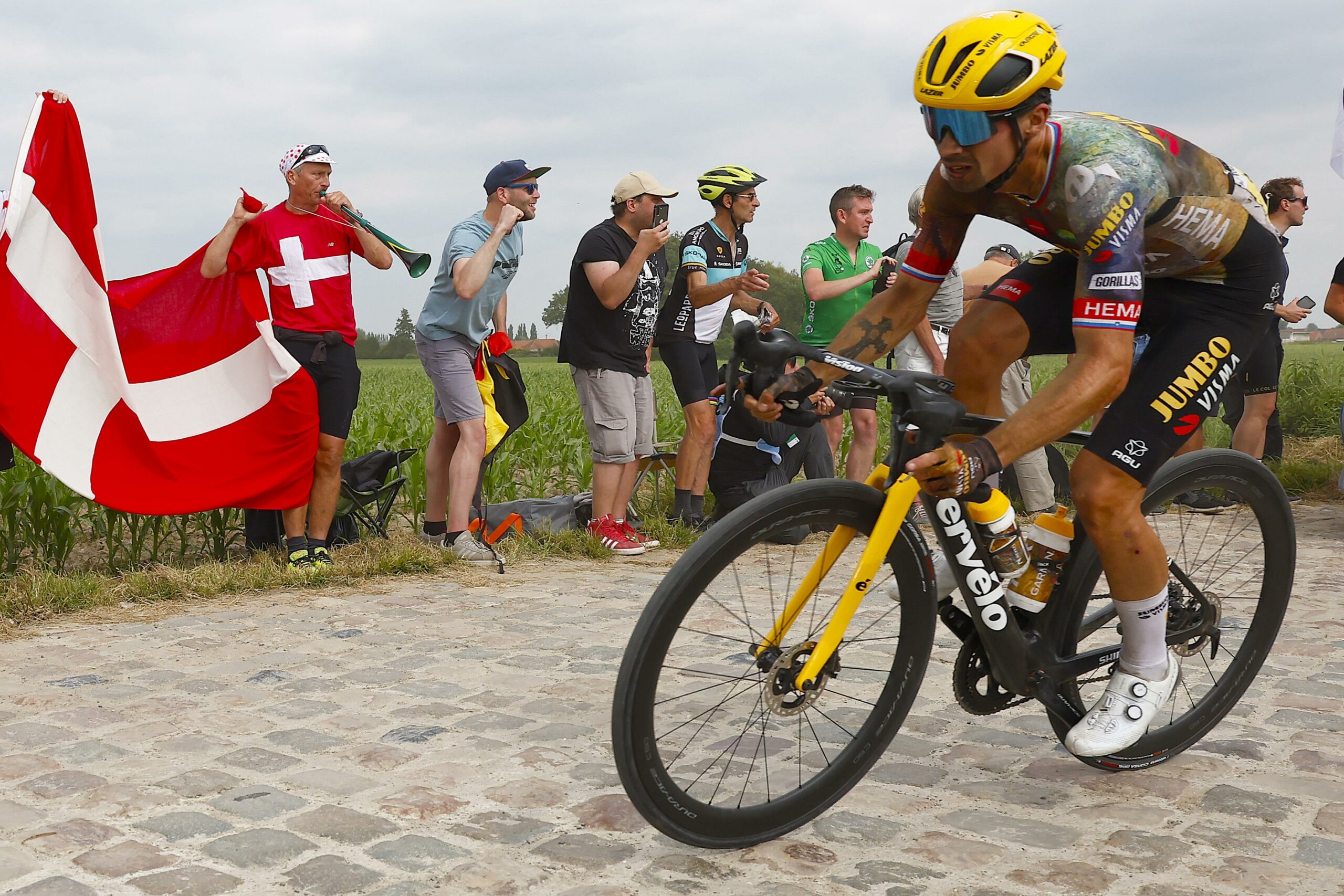 Dat wordt dus wennen voor Robert Gesink, Wout van Aert, Sepp Kuss, Wilco Kelderman en al die anderen: niet meer vóór maar tégen Primož Roglič fietsen. En het zal ze opvallen dat hij nu weliswaar in het donkergroen rijdt, maar dat zijn rechterarm en rechterschouder nog steeds in hun geel gehuld zijn. Alsof ze hem bij Bora-hansgrohe geleidelijk aan zijn nieuwe ploeg en zijn nieuwe tenue willen laten wennen. Maar nee, de kledingsponsor wenste wat anders.